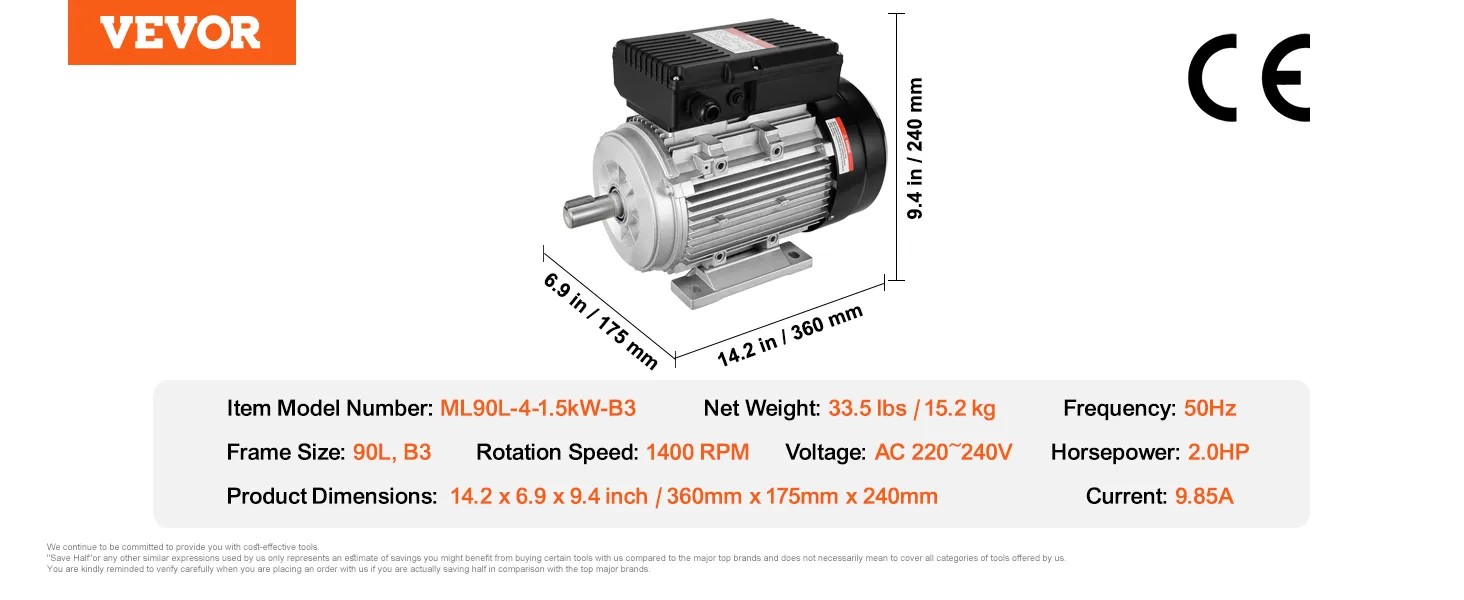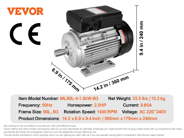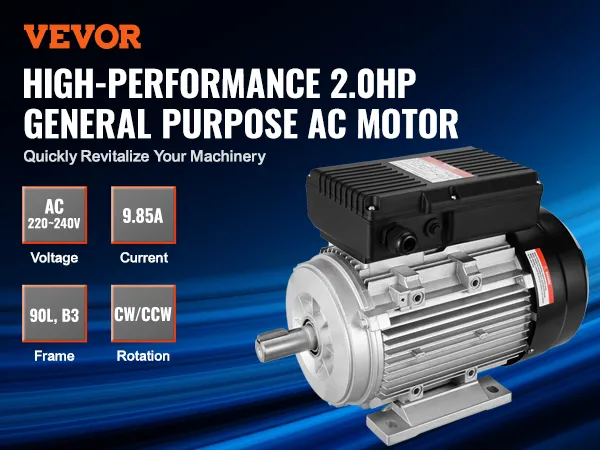 Inject powerful performance into your equipment with the VEVOR 1.5KW electric motor. Operating at AC 220~240V voltage with 9.85A current, it features 1400 RPM high speed, 90L, B3 frame, 50mm shaft length, 24mm keyed shaft, and CW/CCW dual rotation direction.