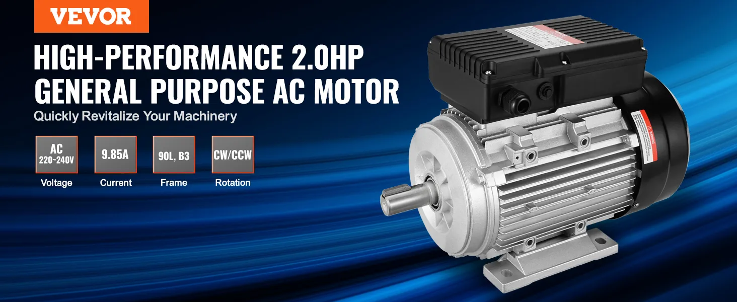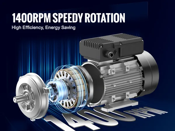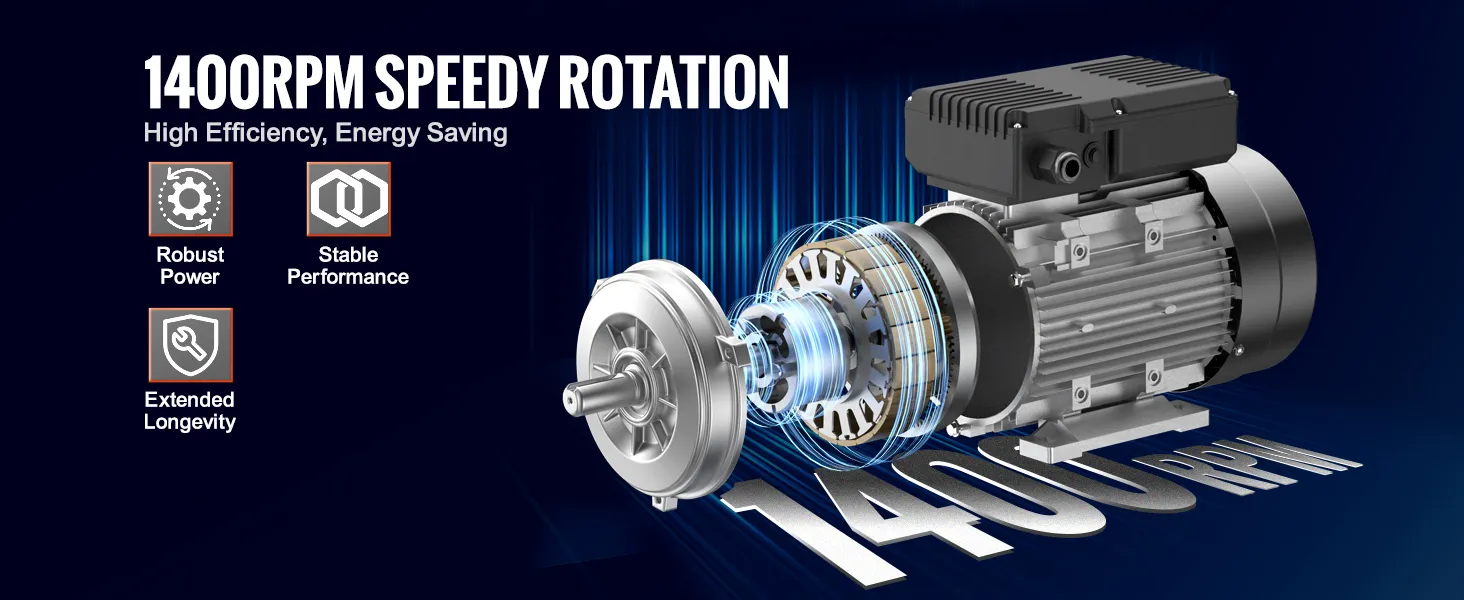 VEVOR 1.5KW electric motor boasts a high speed of 1400RPM, delivering powerful performance across various applications. Its robust power output ensures efficient operation, making it ideal for agricultural machinery and industrial equipment while saving energy and boosting productivity.