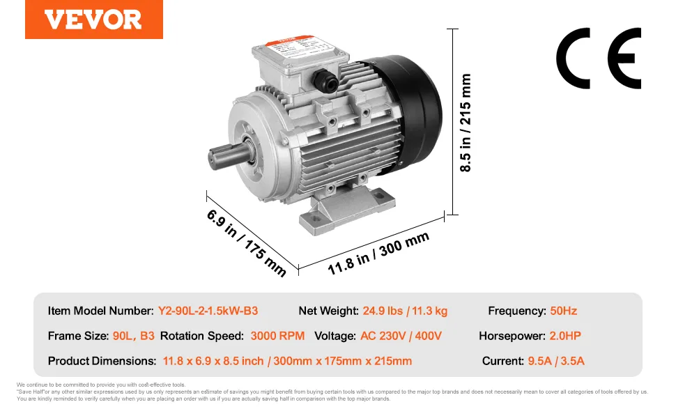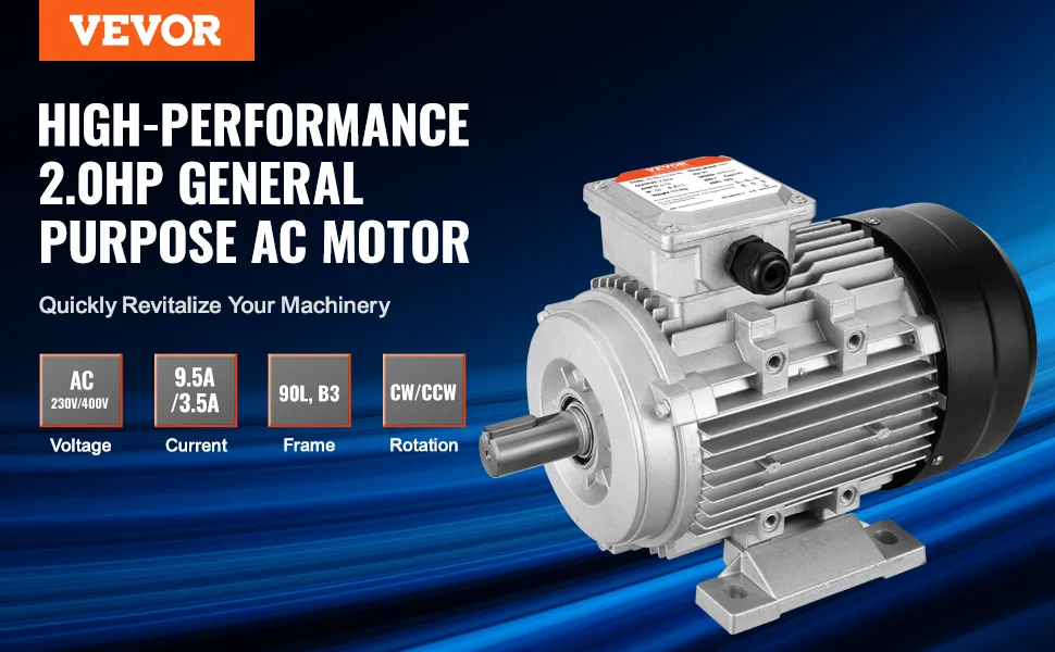 Geef uw apparaat krachtig vermogen met de VEVOR 3-fase elektromotor 1,5 kW. Het werkt met AC230/400V-spanning en 9,5A/3,5A-stroom, biedt 3000 RPM hoge snelheid, 90L, B3-frame, 50 mm aslengte, 24 mm spline-as en dubbele rotatierichting CW/CCW.