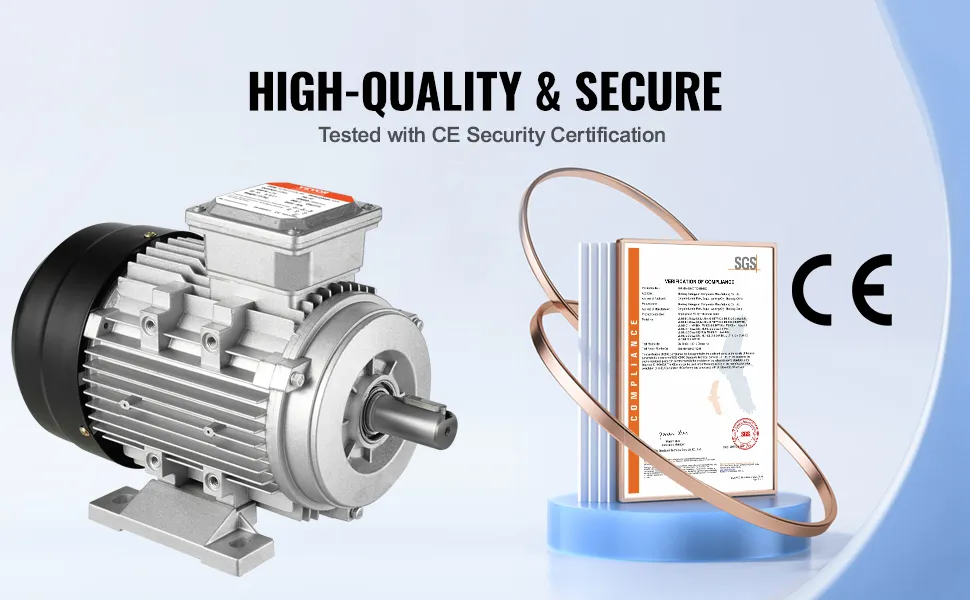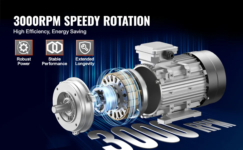 De 1,5 kW sterke elektromotor van VEVOR biedt een hoog toerental van 3000 tpm. De robuuste vermogensafgifte zorgt voor een efficiënte werking, waardoor hij ideaal is voor landbouwmachines en industriële installaties, waardoor energie wordt bespaard en de productiviteit wordt verhoogd.