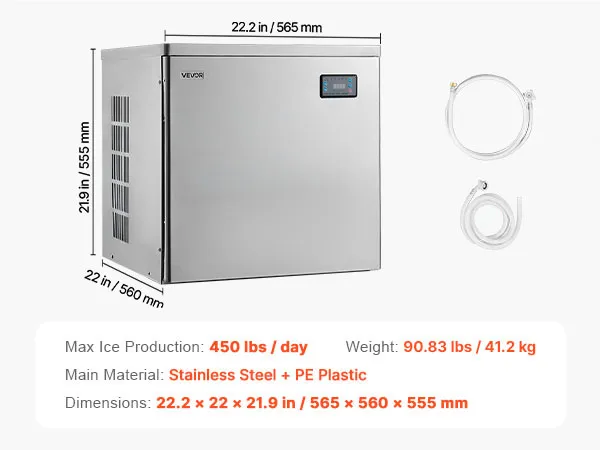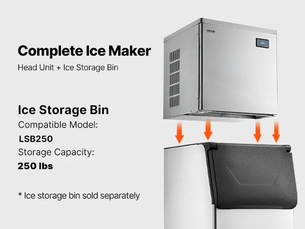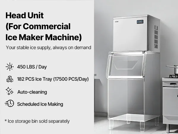 IJsproductie op grote schaal: De commerciële ijsmachine (kop) kan 204 kg ijs per dag produceren, wat neerkomt op ongeveer 17.500 ijsblokken. Zo wordt een continue aanvoer van grote hoeveelheden ijs gegarandeerd.