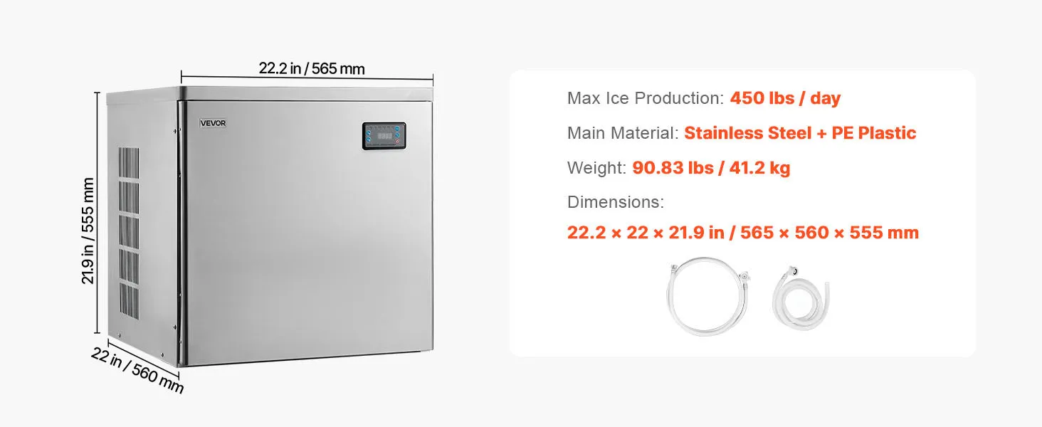 Snelle ijsproductie: De commerciële ijsmachine is uitgerust met 182 ijsblokjesbakjes. U kunt de ijsdikte aanpassen door de ijsproductietijd te verlengen of te verkorten. De krachtige compressor produceert ijsblokjes in slechts 12-15 minuten.