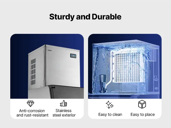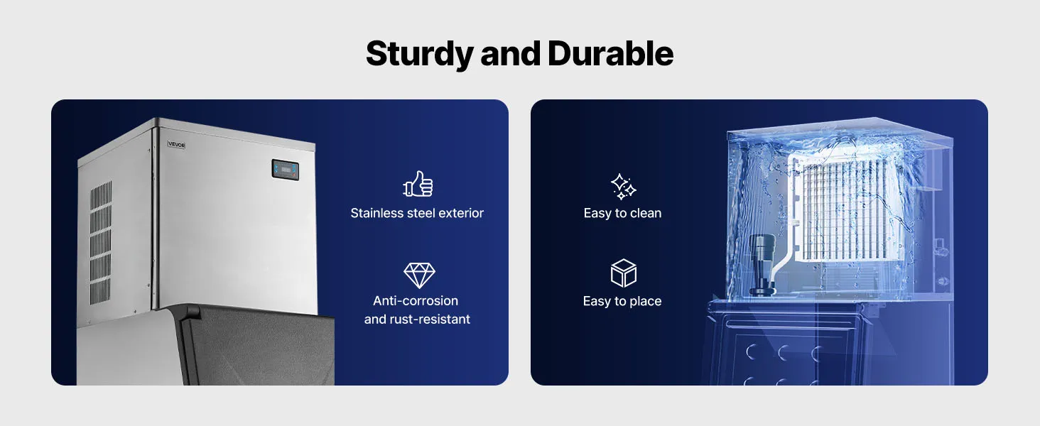De commerciële ijsmachine heeft een behuizing van hoogwaardig roestvrij staal. Dit is roest- en corrosiebestendig, eenvoudig te reinigen en uiterst duurzaam.
