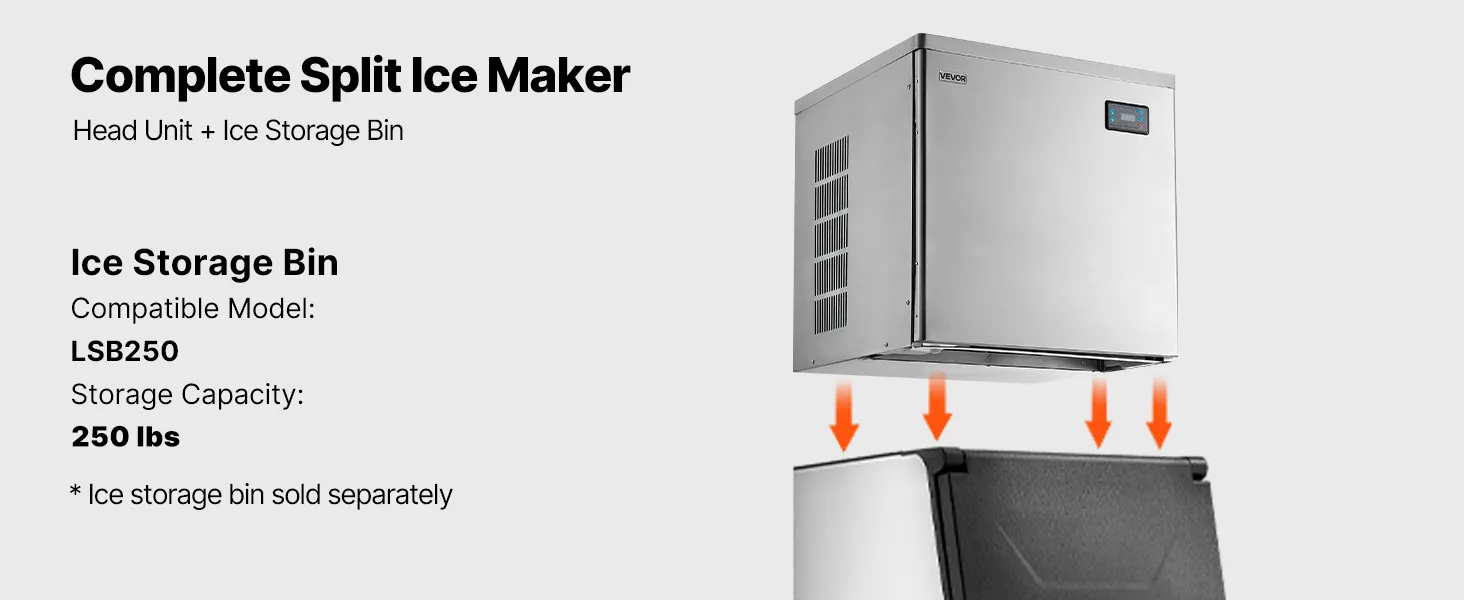 De hoofdunit en de ijshopper vormen samen een complete commerciële ijsmachine. We bieden een uitvoering met een ijshopper van 113 kg aan, die apart verkrijgbaar is.