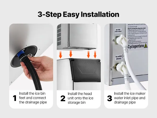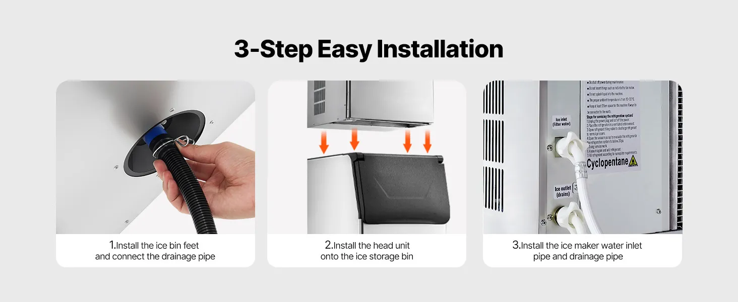 De ijsmachine is eenvoudig te installeren en het zwaartekrachtafvoerontwerp zorgt voor een snelle en efficiënte waterafvoer.