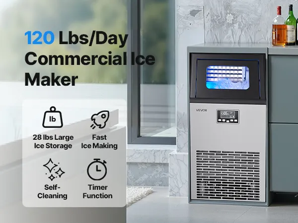 Efficient Ice Making: The commercial ice maker produces 45 cubes per cycle and up to 120 lbs of ice daily, with 28 lbs of ice storage. Ideal for home, bar, or light commercial use. ETL and ENERGY STAR certified for secure and efficient performance