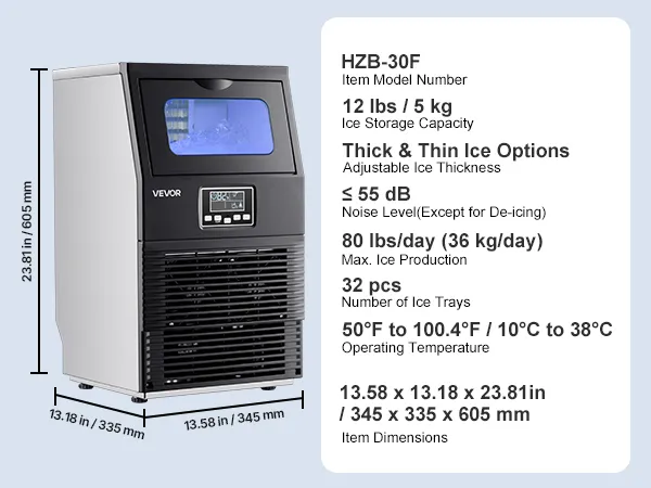 Efficiënte ijsproductie: Deze commerciële ijsmachine produceert 32 ijsblokjes per cyclus en tot 36 kg ijs per dag, met een ijsopslagcapaciteit van 5 kg. Ideaal voor thuisgebruik, bars en commerciële toepassingen. ETL- en ENERGY STAR-gecertificeerd voor veilige en efficiënte prestaties.