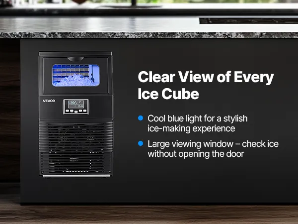 Gebruiksvriendelijk: Deze ijsblokjesmachine is voorzien van intuïtieve led-bediening. Selecteer eenvoudig dikke of dunne blokjes met één druk op de knop. Dankzij het grote kijkvenster en de blauwe binnenverlichting kunt u het ijsproductieproces in de gaten houden zonder het deksel te openen.