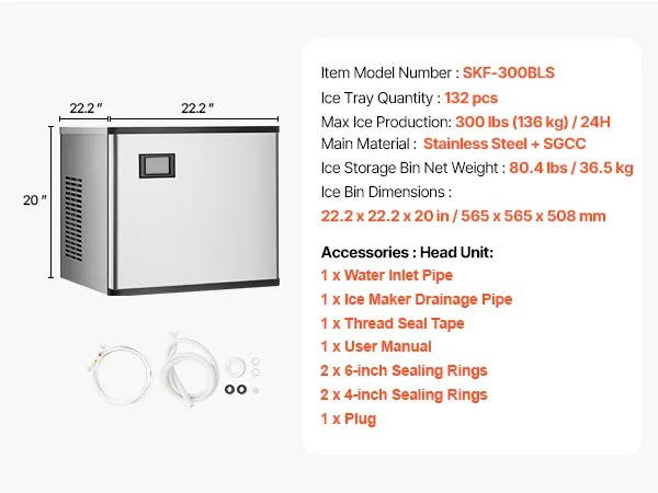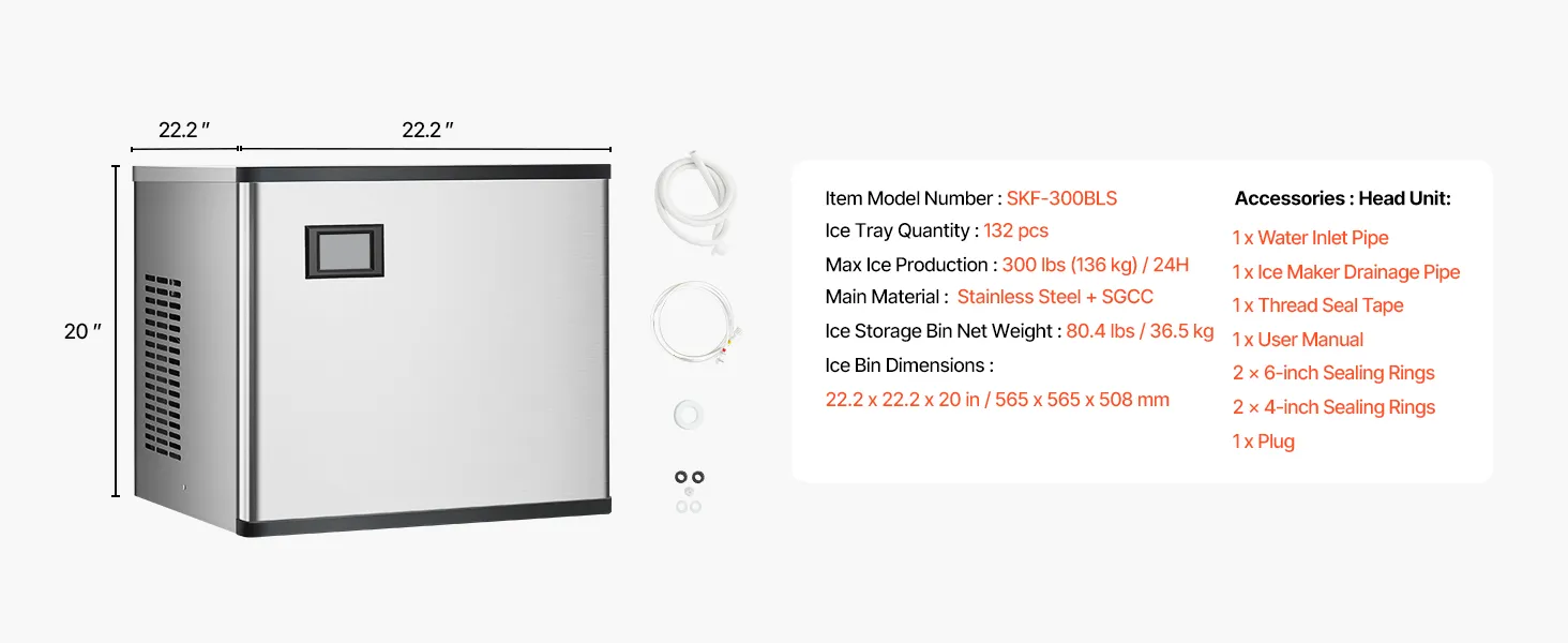 Large Ice Production: The commercial ice maker (head) can produce 300 lbs of ice per 24 hours, which is approximately 13,000 pieces of ice, providing a continuous supply of ice in large quantities.