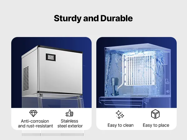 The commercial ice maker machine features a refined stainless steel shell, which is rust and corrosion-resistant, easy to clean, and highly durable.
