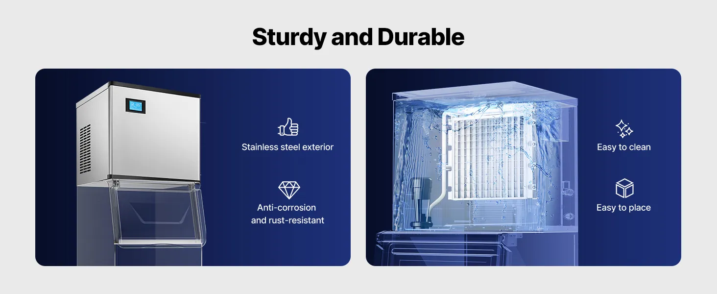 Fast Ice Production: The commercial ice maker is equipped with 132 ice trays. You can adjust the thickness of the ice by increasing or shortening the ice-making time. The powerful compressor can produce ice cubes in just 12-15 minutes.