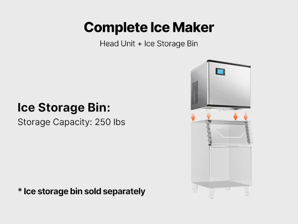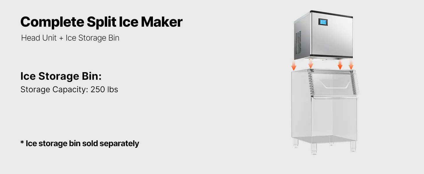 The head unit and ice bin combine to form a complete commercial ice maker. We provide a 250lbs ice bin configuration, which is sold separately.