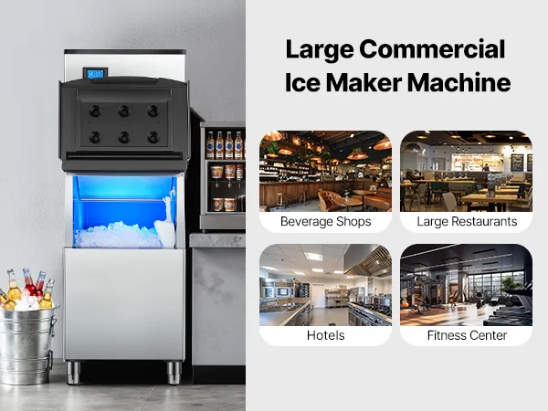 The ice cube machine provides a large ice output, making it ideal for commercial kitchens, restaurants, bars, hotels, and beverage shops.