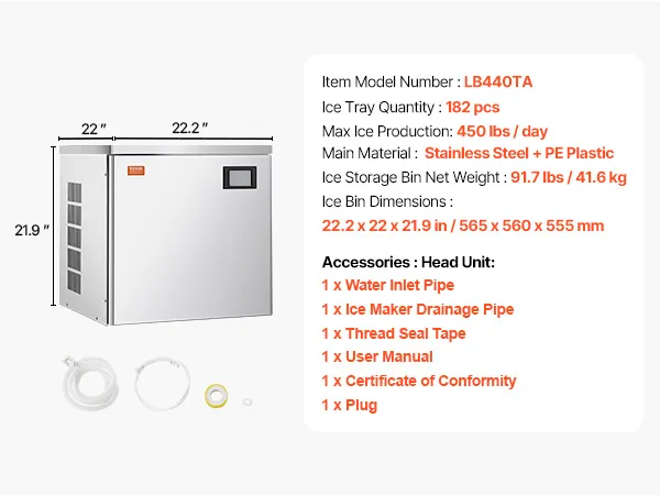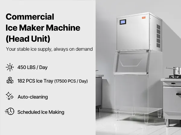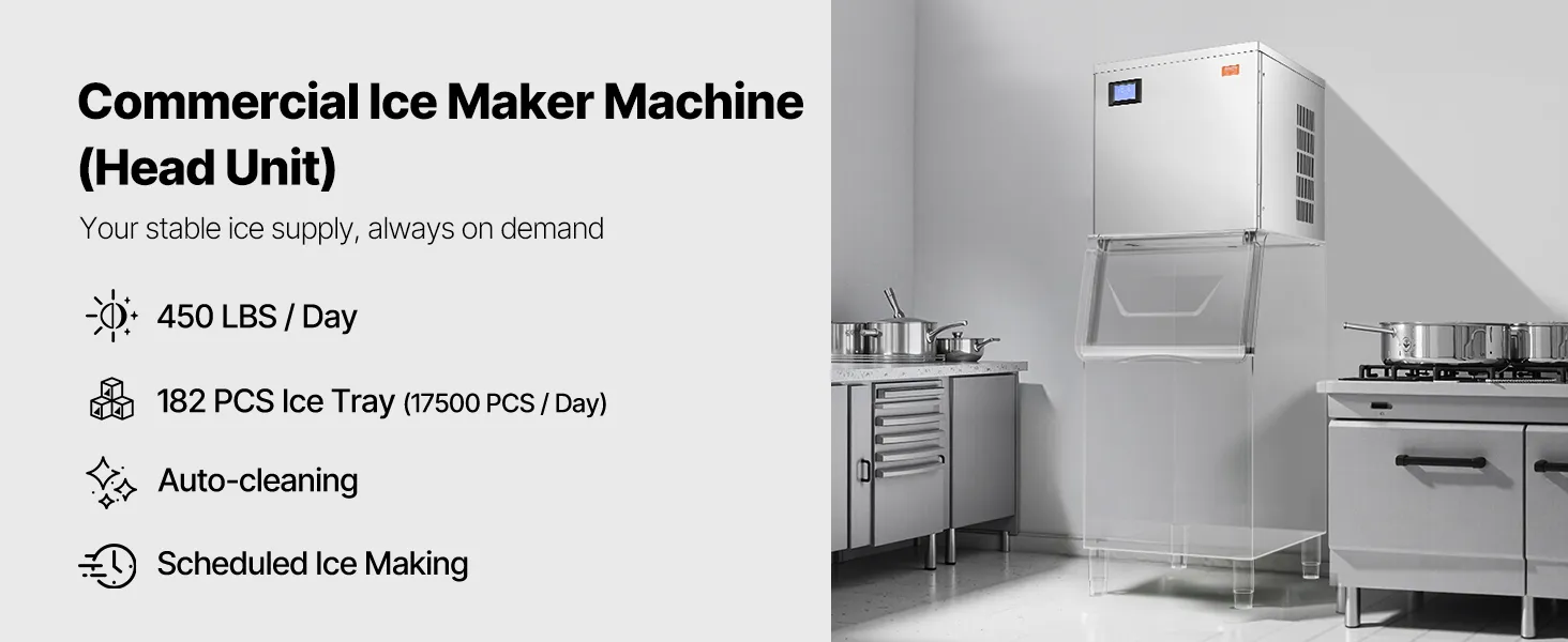 Large Ice Production: The commercial ice maker (head) can produce 450 lbs of ice per 24 hours, which is approximately 17,500 pieces of ice, providing a continuous supply of ice in large quantities.
