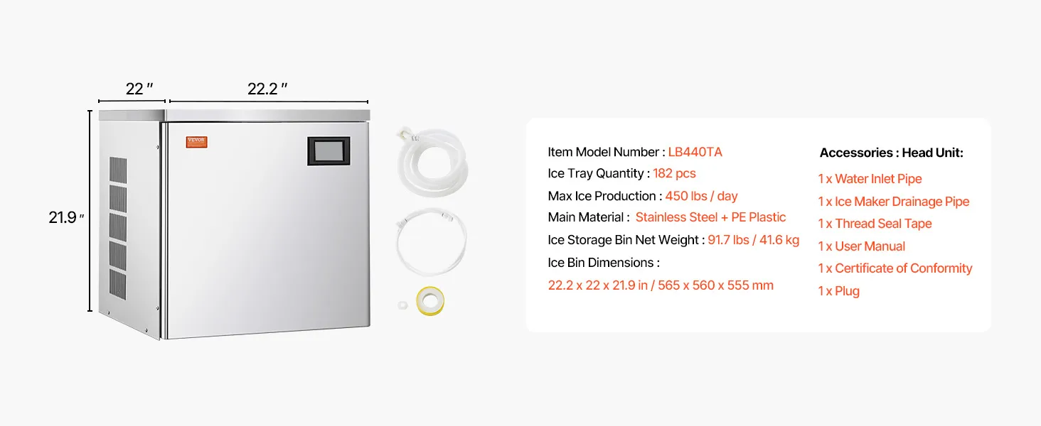 VEVOR Commercial Ice Maker Machine 450 lbs/Day, 22 Inch Stainless Steel Industrial Ice Machine, Self-Cleaning and Scheduled Ice Making, Modular Ice Cube Machine for Restaurant Hotel - Head Only