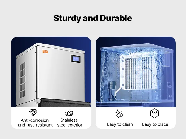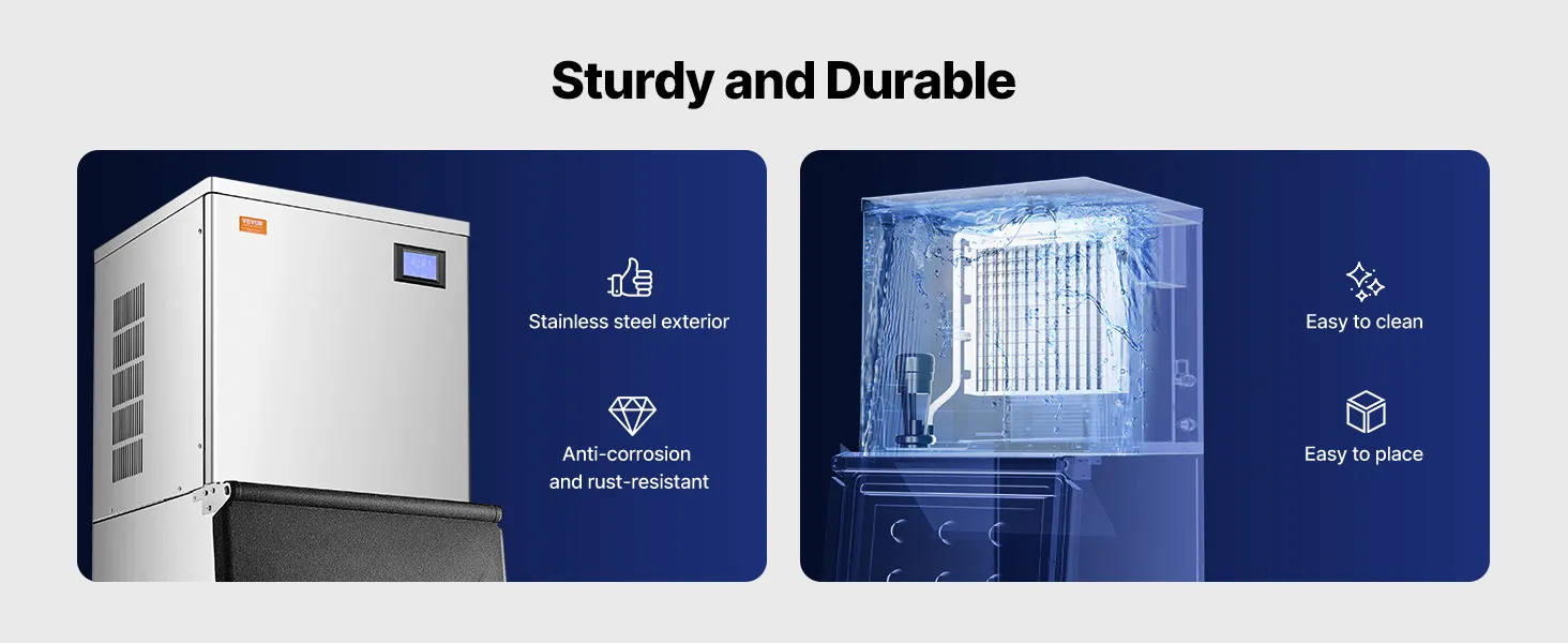 The commercial ice maker machine features a refined stainless steel shell, which is rust and corrosion-resistant, easy to clean, and highly durable.