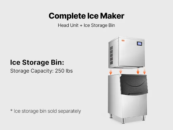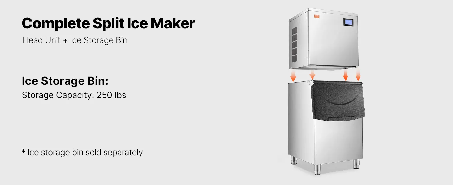 The head unit and ice bin combine to form a complete commercial ice maker. We provide a 250lbs ice bin configuration, which is sold separately.