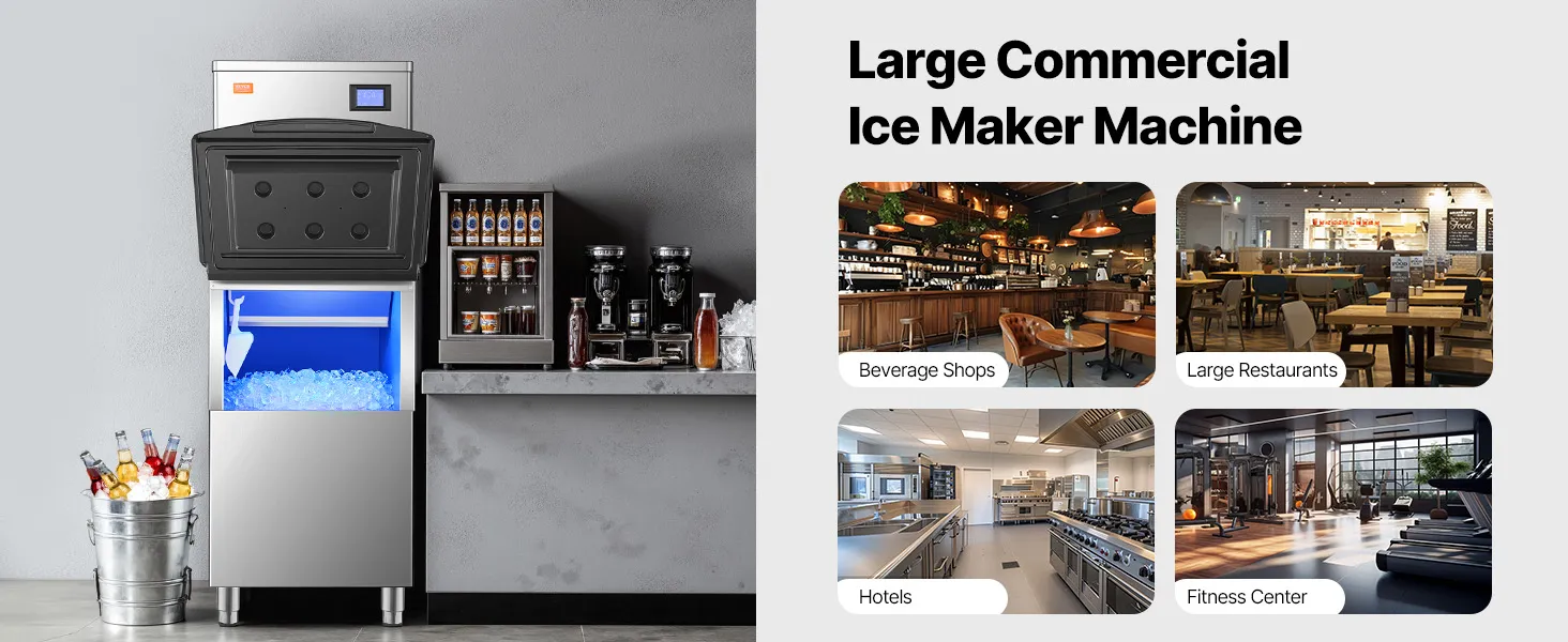 The ice cube machine provides a large ice output, making it ideal for commercial kitchens, restaurants, bars, hotels, and beverage shops.