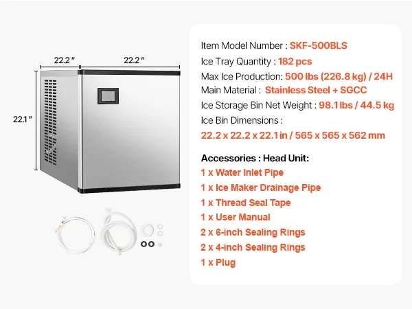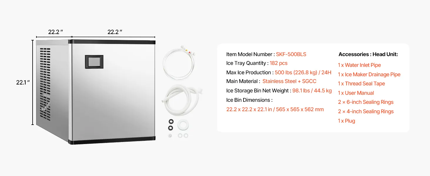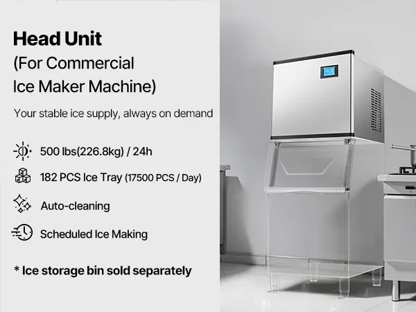 Large Ice Production: The commercial ice maker (head) can produce 500 lbs of ice per 24 hours, which is approximately 17,500 pieces of ice, providing a continuous supply of ice in large quantities.
