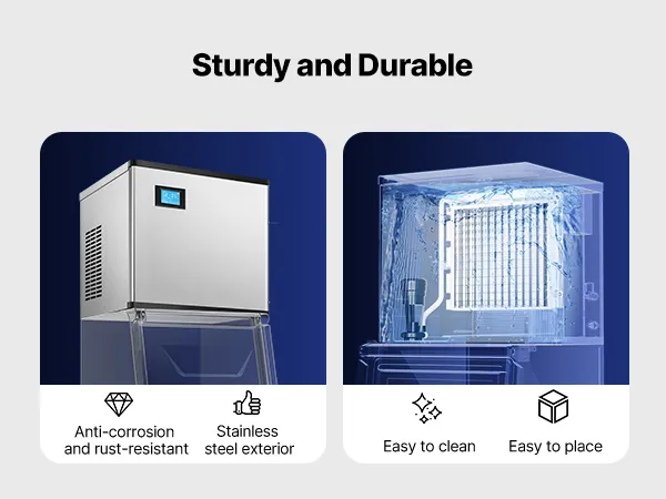 The commercial ice maker machine features a refined stainless steel shell, which is rust and corrosion-resistant, easy to clean, and highly durable.