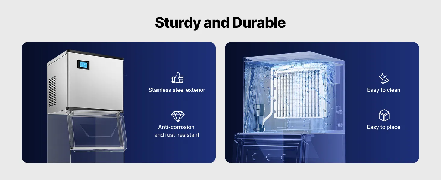 Fast Ice Production: The commercial ice maker is equipped with 182 ice trays. You can adjust the thickness of the ice by increasing or shortening the ice-making time. The powerful compressor can produce ice cubes in just 12-15 minutes.