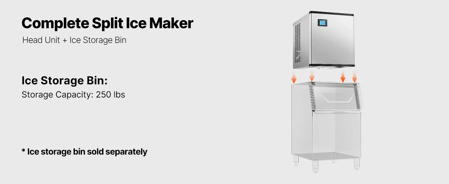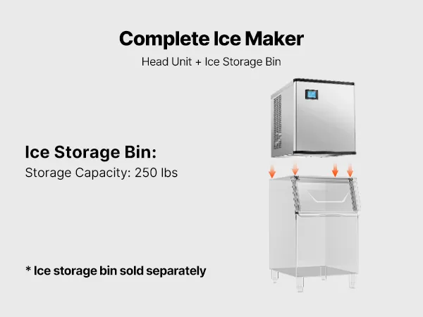 The head unit and ice bin combine to form a complete commercial ice maker. We provide a 250lbs ice bin configuration, which is sold separately.