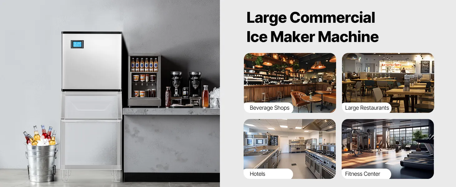 The ice cube machine provides a large ice output, making it ideal for commercial kitchens, restaurants, bars, hotels, and beverage shops.