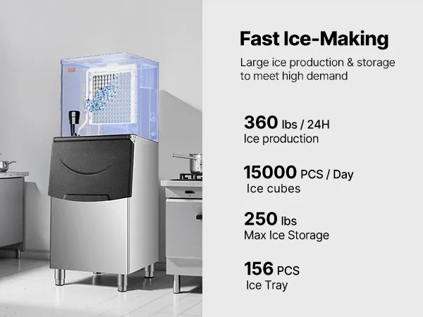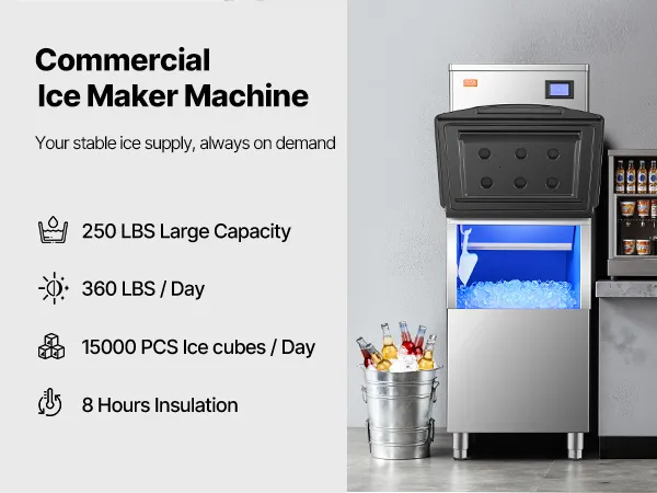 Grote ijsproductie: Deze commerciële ijsmachine kan 360 lbs (163 kg) ijs per dag produceren, met een grote capaciteit van 250 lbs en uitstekende isolatie, wat zorgt voor een continue aanvoer van ijs
