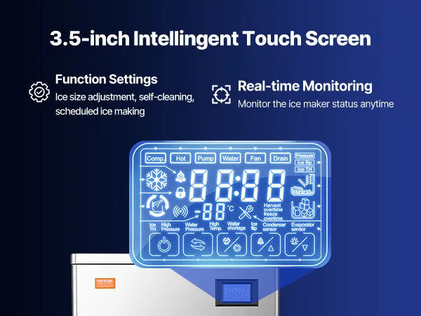 Intelligent bedieningspaneel: Met het intelligente touchscreen kunt u eenvoudig de ijsdikte aanpassen en de zelfreinigingsfunctie activeren. De indicatielampjes op het bedieningspaneel geven realtime-informatie over de status van de ijsblokjesmachine.