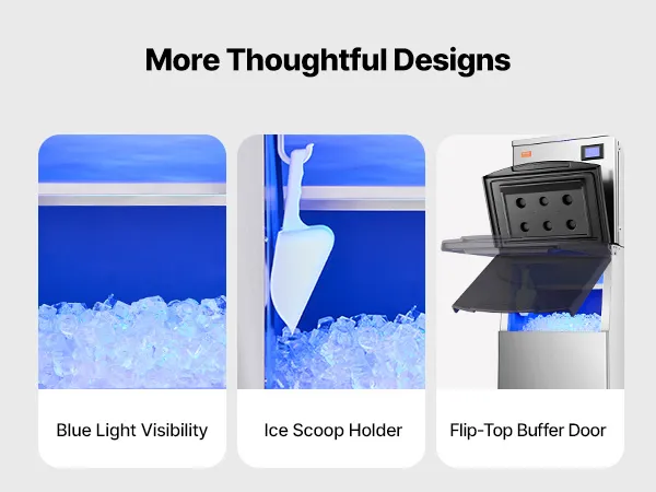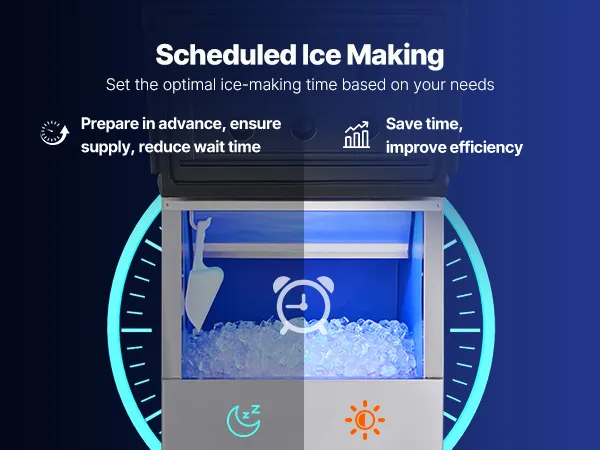 Snel ijs maken: De ijsblokjesmachine is uitgerust met 156 ijsblokjesbakjes, waardoor u de dikte van het ijs kunt aanpassen door de ijsmaaktijd te wijzigen. De krachtige compressor kan binnen 12 tot 15 minuten ijs produceren.