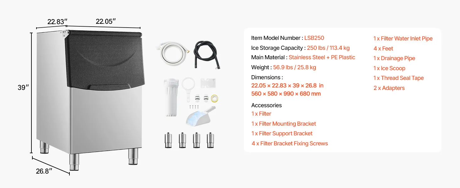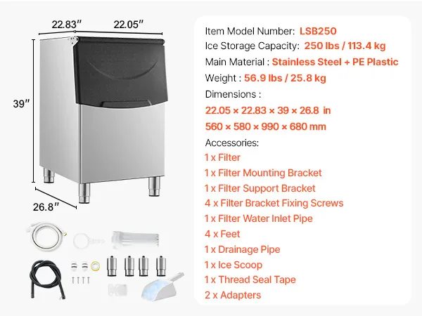 Large Ice Storage: The commercial ice maker (ice bin) can store up to 250 lbs / 113.4 kg of ice, providing a large reserve of ice for your needs.