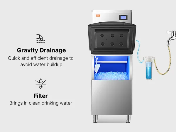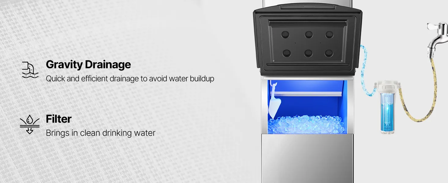 The ice storage bin is equipped with a water filter to purify the water, providing clean drinking water, while the gravity drainage function ensures efficient water discharge.