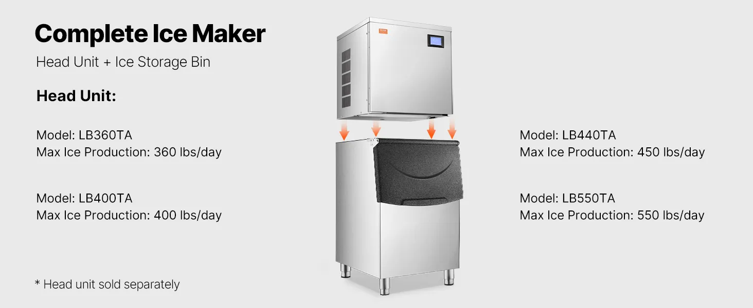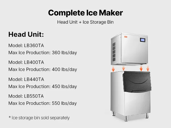 The head unit and ice bin combine to form a complete commercial ice maker. We provide head units with different ice-making capacities, which need to be purchased separately.