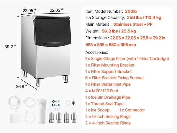 VEVOR Commercial Ice Maker Storage Bin, 250LBS Capacity Ice Bin, Stainless Steel Ice Storage Bin with Single-stage Filter and Adjustable Anti-slip Rubber Feet, Suitable for Restaurant and Hotel