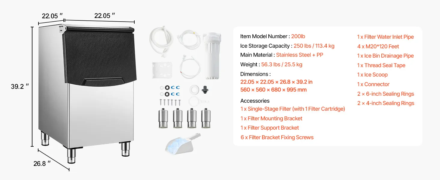 Large Ice Storage: The commercial ice maker (ice bin) can store up to 250 lbs / 113.4 kg of ice, providing a large reserve of ice for your needs.