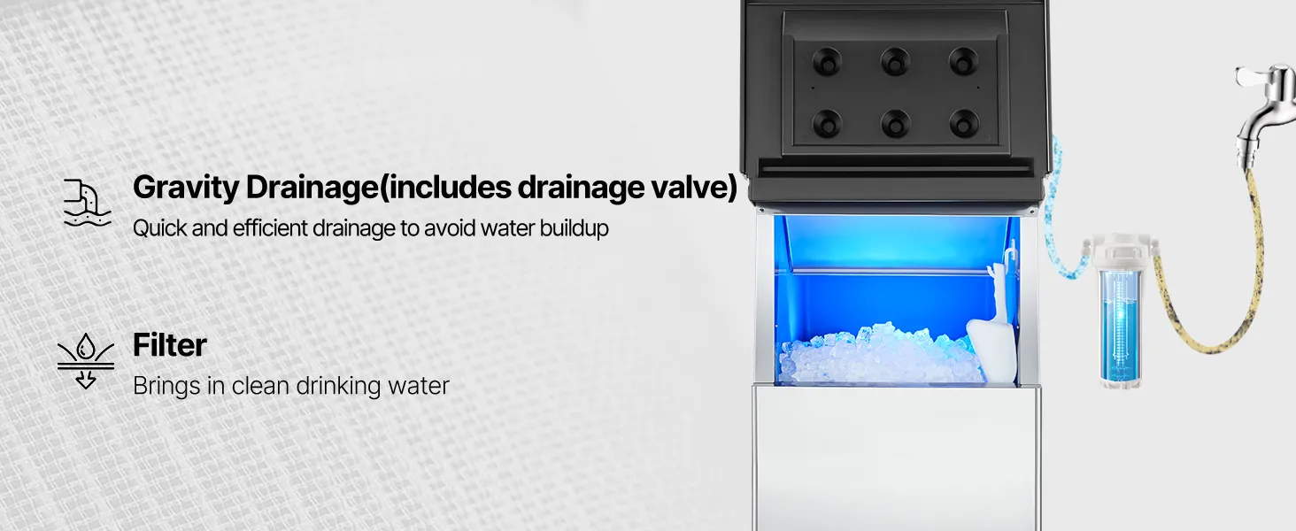 The ice storage bin is equipped with a water filter to purify the water, providing clean drinking water, while the gravity drainage function ensures efficient water discharge.
