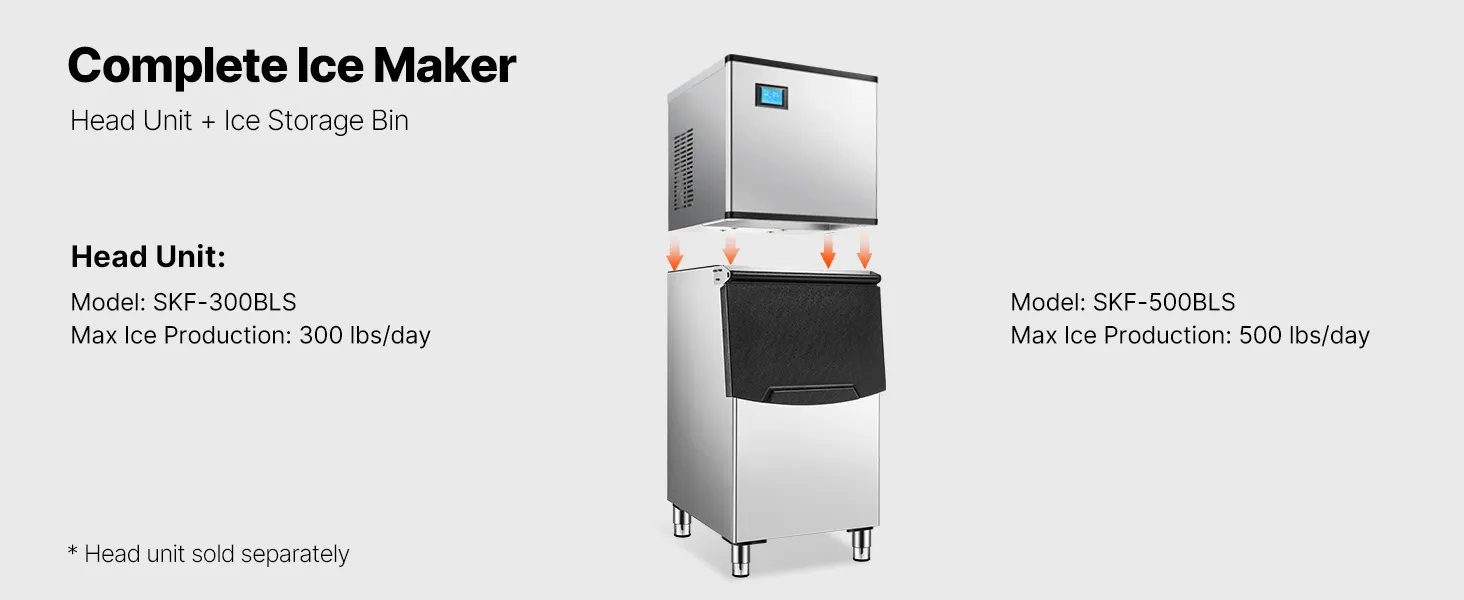 The head unit and ice bin combine to form a complete commercial ice maker. We provide head units with different ice-making capacities, which need to be purchased separately.