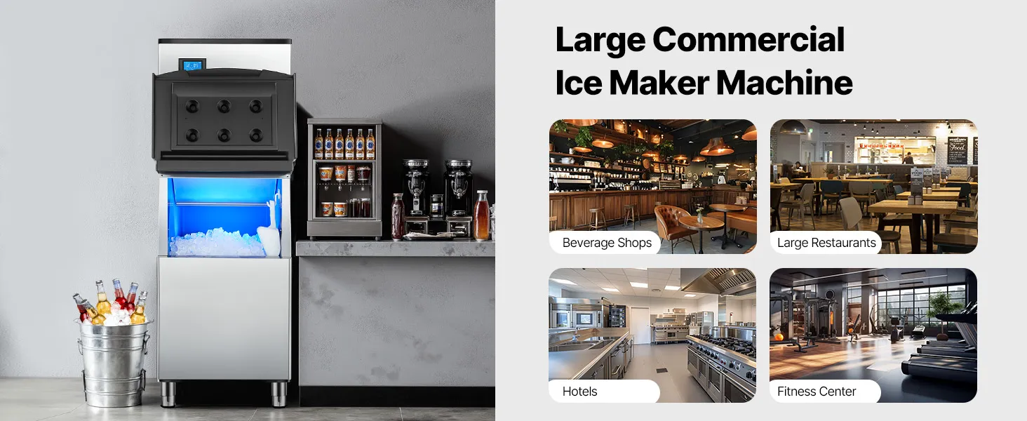 The ice cube machine provides a large ice output, making it ideal for commercial kitchens, restaurants, bars, hotels, and beverage shops.