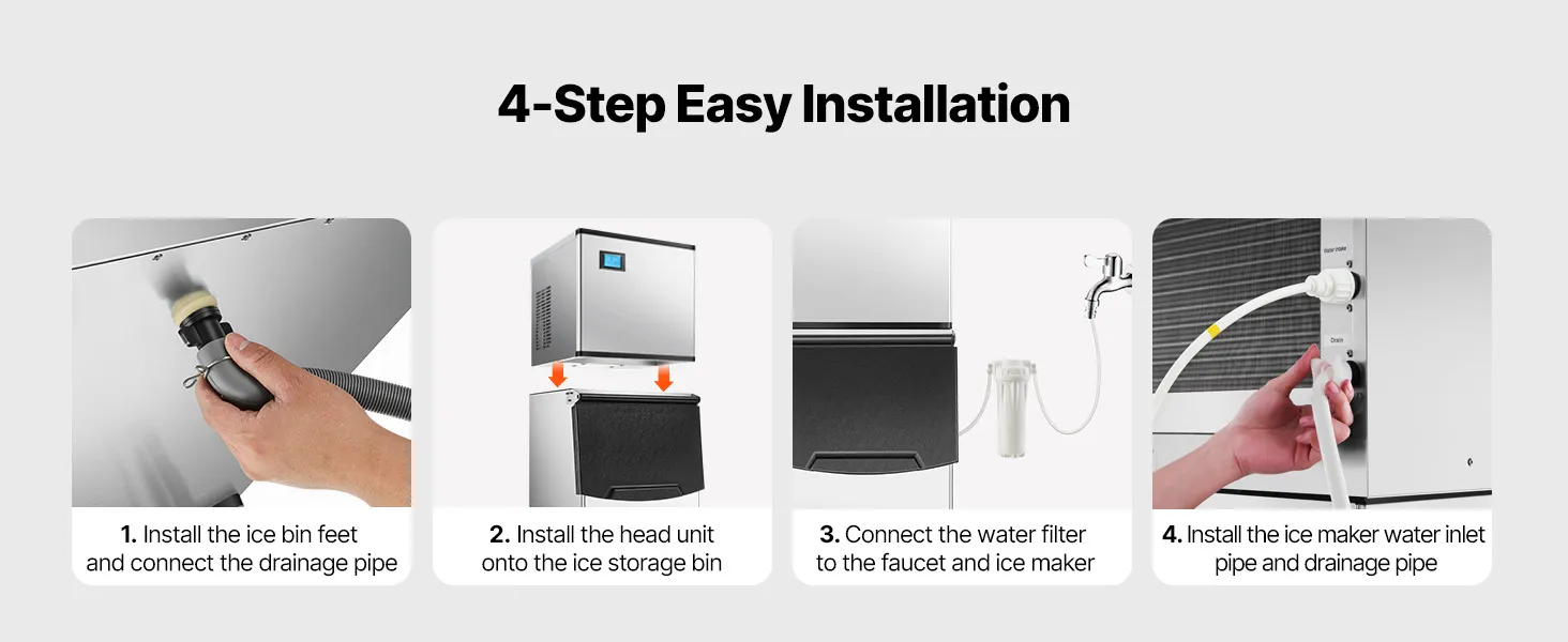 The commercial ice maker machine is easy to install, and the gravity drainage design ensures quick and efficient water discharge.