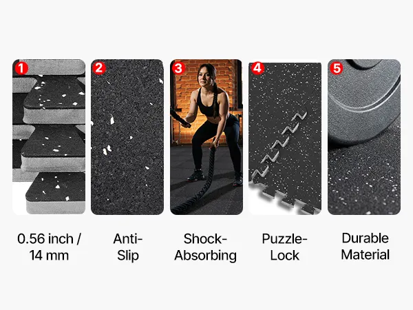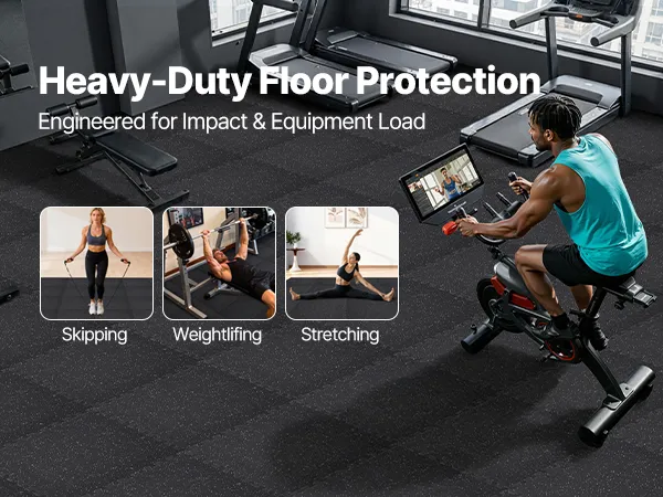 Duurzaam en slijtvast: Gemaakt van slijtvast rubber. Zelfs bij gebruik met apparatuur die constante wrijving veroorzaakt, zoals krachtrekken en spinningfietsen, zullen onze rubberen vloermatten niet snel slijten of scheuren.