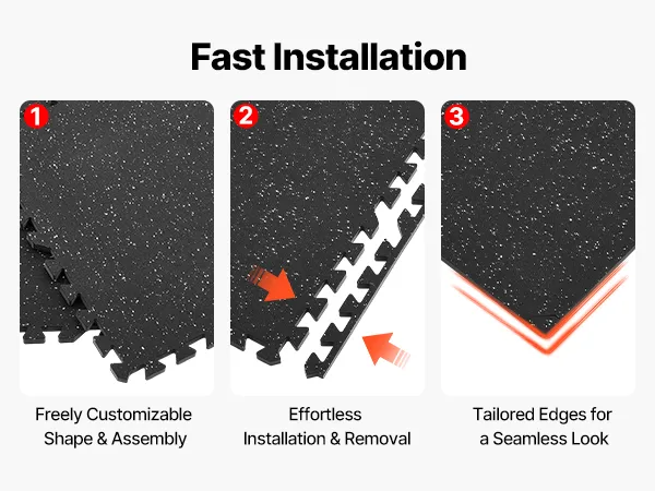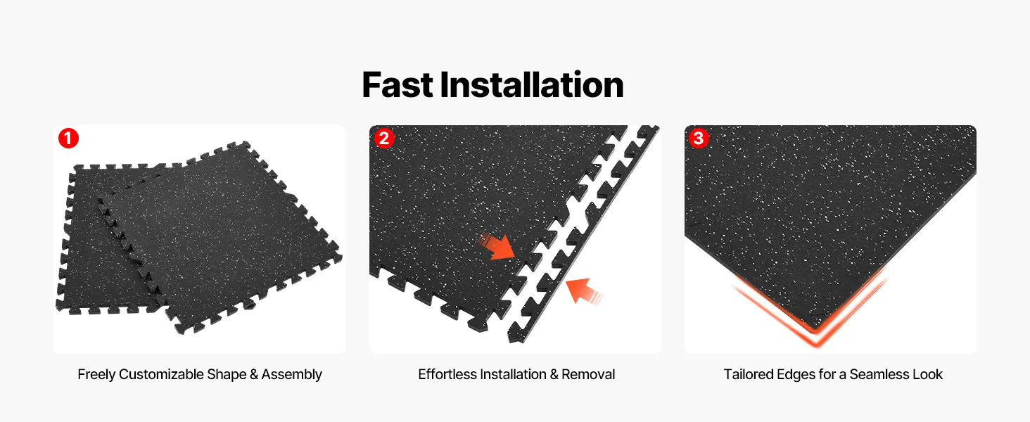 Flexibele indeling: Deze vloerbeschermingsmattenset is voorzien van een insteeksysteem waardoor één persoon de matten snel en zonder gereedschap kan monteren. De matten kunnen naar behoefte worden gekoppeld en verlengd, of op maat worden geknipt voor onregelmatige oppervlakken.