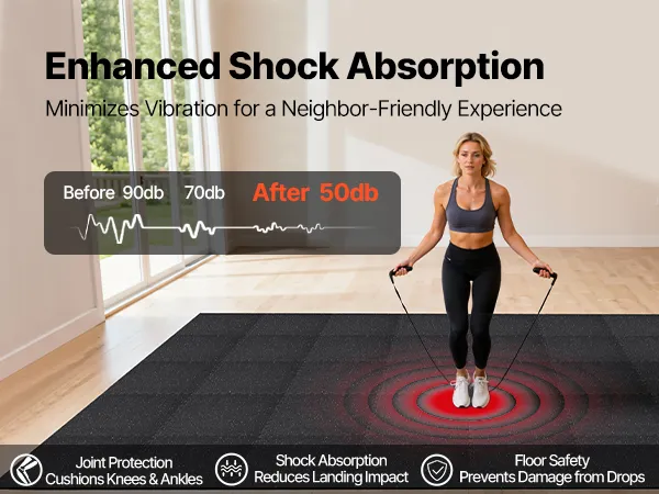 Duurzaam en slijtvast: Gemaakt van slijtvast rubber. Zelfs bij gebruik met apparatuur die constante wrijving genereert, zoals krachtrekken en spinningfietsen, slijten of scheuren onze rubberen vloermatten niet snel.