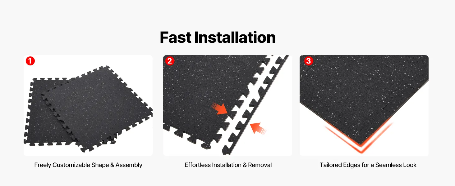 Flexibele indeling: Deze vloerbeschermingsmattenset is voorzien van een insteeksysteem waardoor één persoon de matten snel en zonder gereedschap kan monteren. De matten kunnen naar behoefte worden gekoppeld en verlengd, of op maat worden geknipt voor onregelmatige oppervlakken.