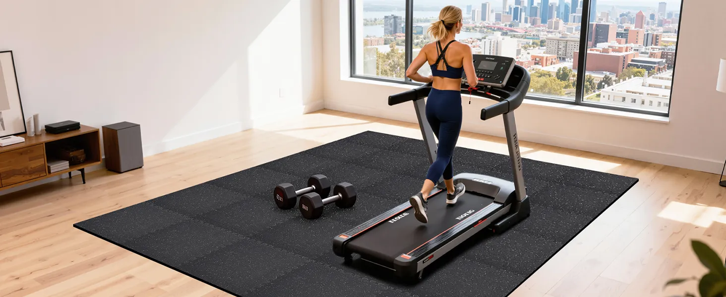 Effectieve geluids- en schokdemping: De dikke rubberen mat voor fitnessapparatuur vermindert trillingen en geluid van de apparatuur – ideaal voor appartementen en thuissportscholen.