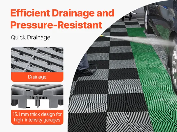 Extra dik ontwerp: onze in elkaar grijpende drainagemat heeft een verbeterde dikte van 0,6 inch (15,1 mm), wat de drainage-efficiëntie verhoogt. Het verwijdert snel waterophopingen in de garage en ondersteunt tegelijkertijd effectief het gewicht van het voertuig. De stevige constructie biedt een uitstekend draagvermogen en is daarom ideaal voor garages met veel verkeer.