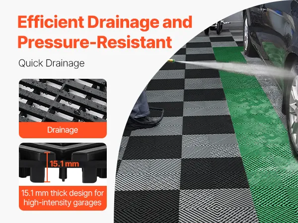 • Extra-Thick Design: Our interlocking drainage mat features an upgraded 15 mm thickness, boosting drainage efficiency. It rapidly clears garage water buildup while effectively supporting vehicle weight. Its solid structure offers outstanding load-bearing performance, which is ideal for high-traffic garage areas.
