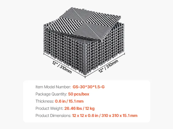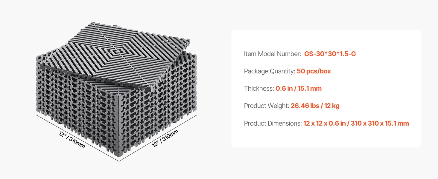 Extra dik ontwerp: onze in elkaar grijpende drainagemat heeft een verbeterde dikte van 15,1 mm (0,6 inch), waardoor de drainage-efficiëntie toeneemt. Het elimineert snel de ophoping van water in de garage en ondersteunt tegelijkertijd het gewicht van het voertuig effectief. Hun solide structuur biedt een uitstekend laadvermogen, ideaal voor drukke garageruimtes.