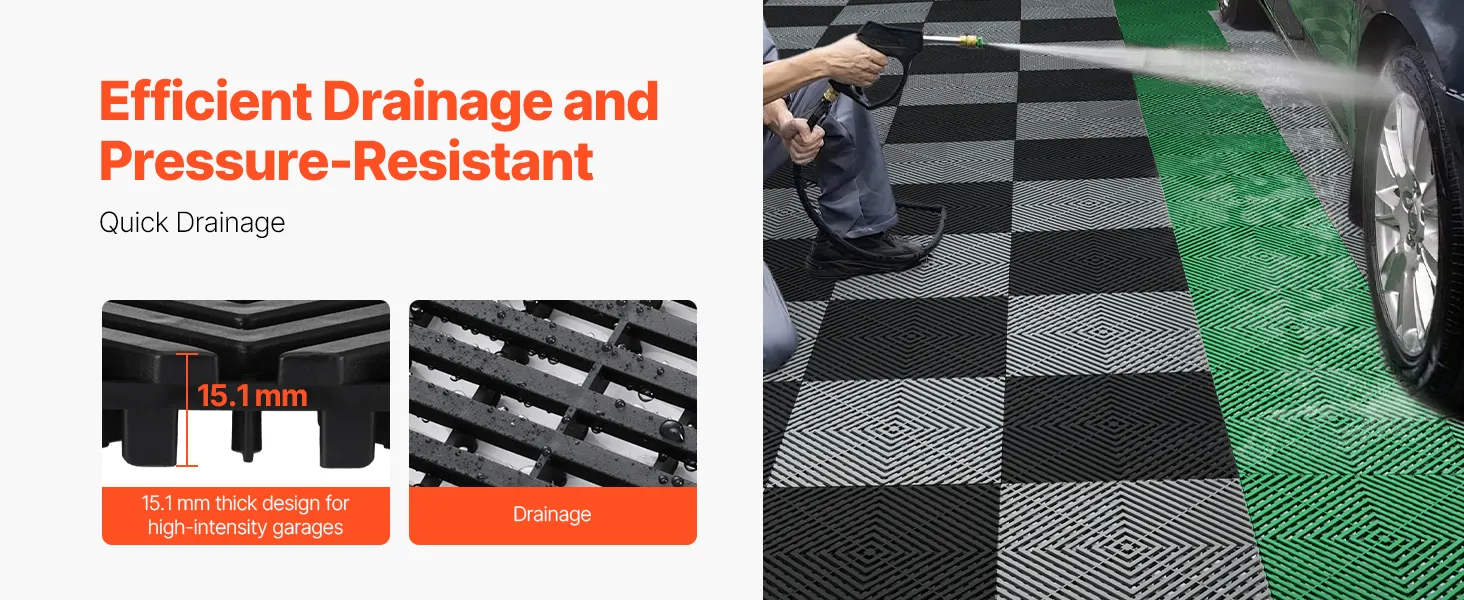 EXTRA DIK ONTWERP: Onze in elkaar grijpende drainagemat heeft een verbeterde dikte van 15 mm, waardoor de drainage-efficiëntie toeneemt. Het elimineert snel de ophoping van water in de garage en ondersteunt tegelijkertijd het gewicht van het voertuig effectief. Hun solide structuur biedt een uitstekend laadvermogen, ideaal voor drukke garageruimtes.