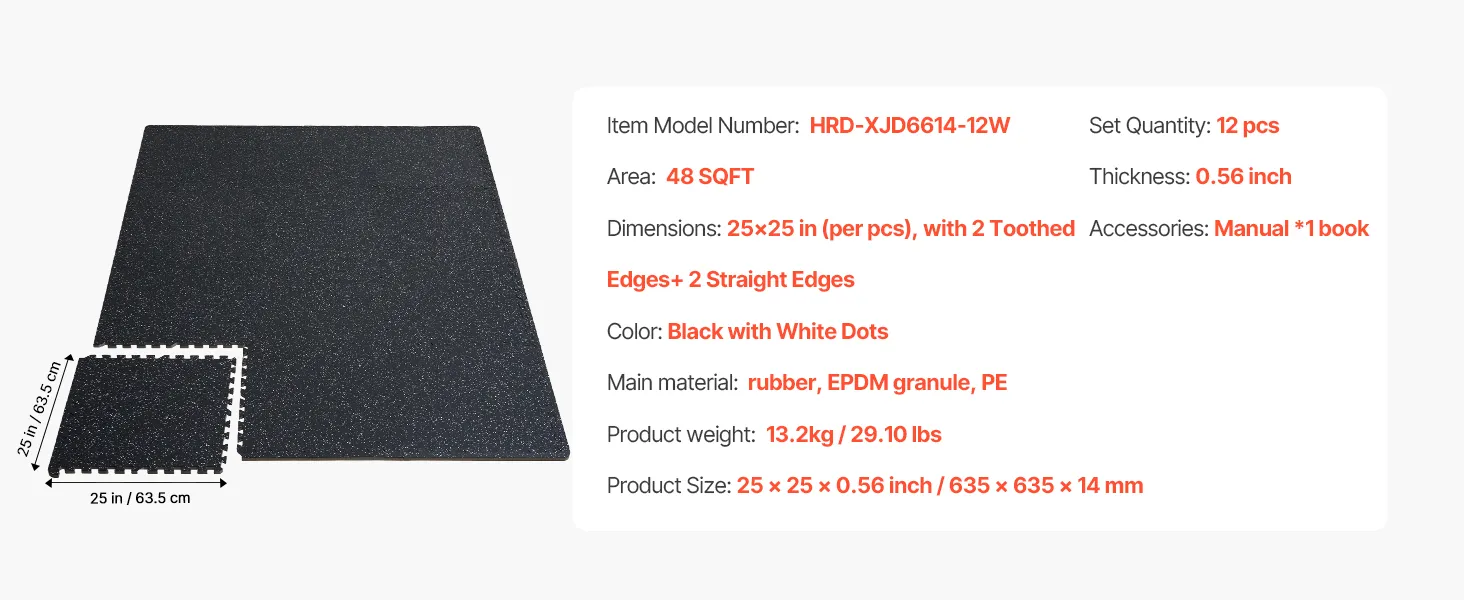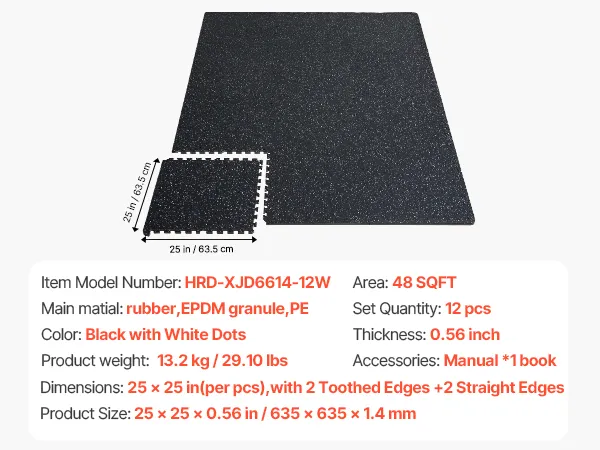 VEVOR 0.56 Inch Thick Gym Floor Mats, 12 Tiles Rubber Top with EVA Foam, 25" x 25" Gym Flooring Workout Mats with 48 sq.ft Coverage, Interlocking Puzzle Gym Mats for Gym, Home, Garage, Black & White