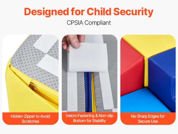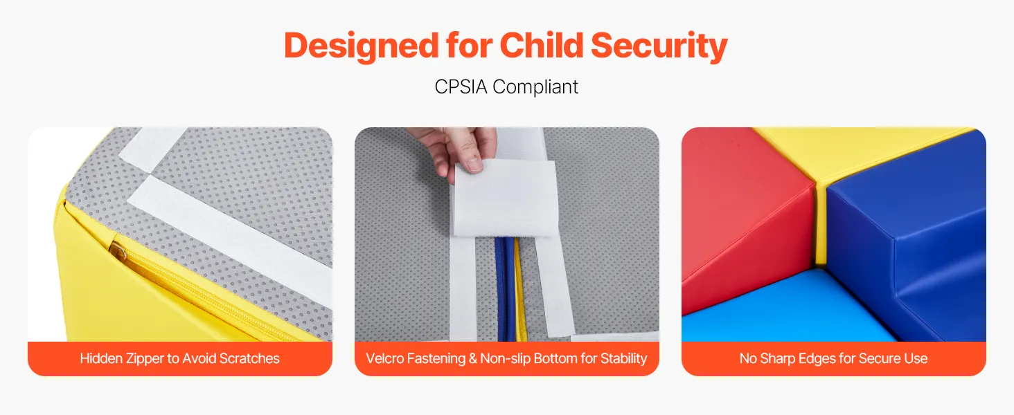 Child Security First: Compliant with U.S. CPSIA standards, the toddler foam climbing blocks are made with secure materials, low VOC, and do not release harmful chemicals, ensuring your child's security and health while playing. The foam blocks have no sharp edges and feature hidden zippers to secure delicate skin.